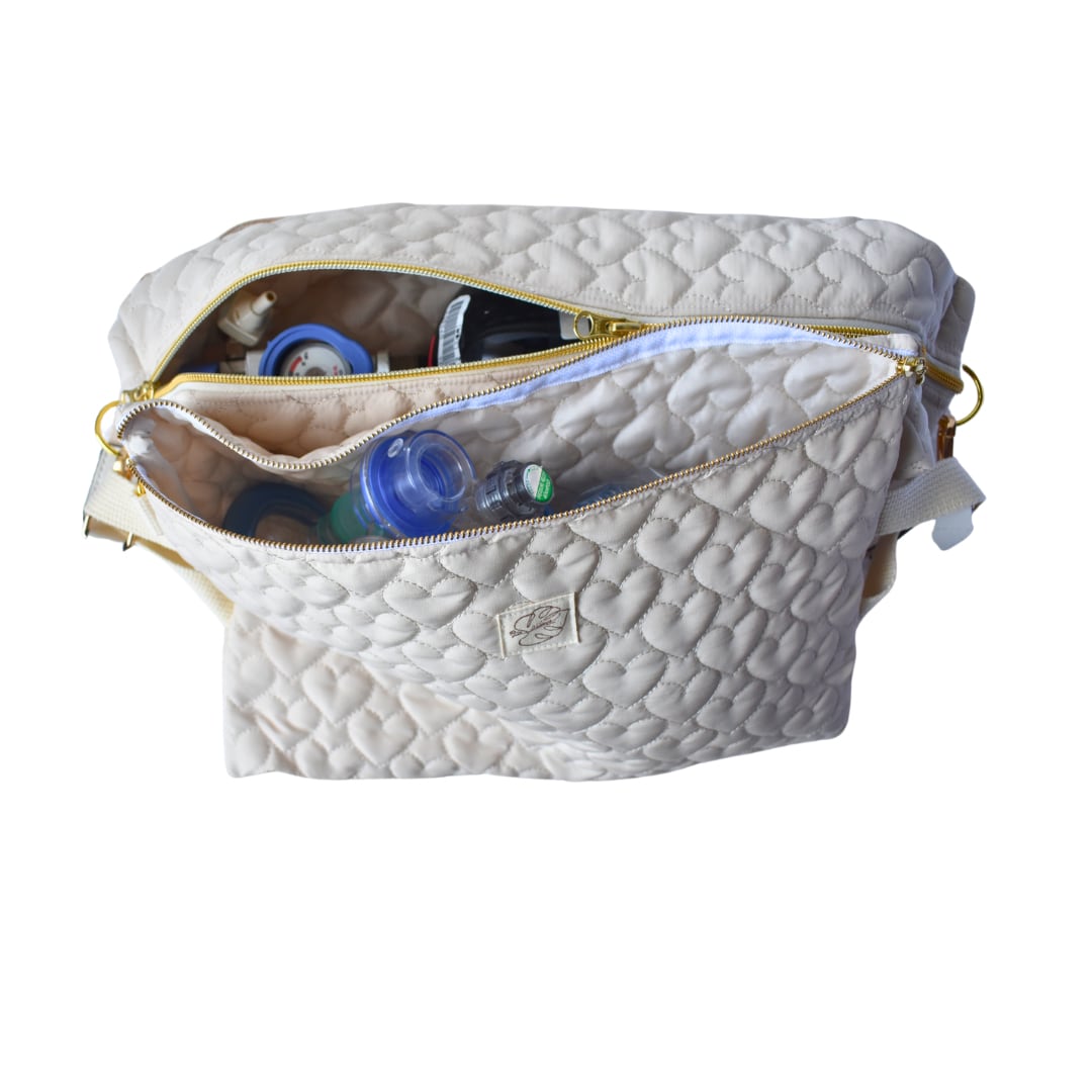 当店の酸素ボンベバッグ(別売)に取り付けることができ、セットでの持ち歩きにも対応しています。