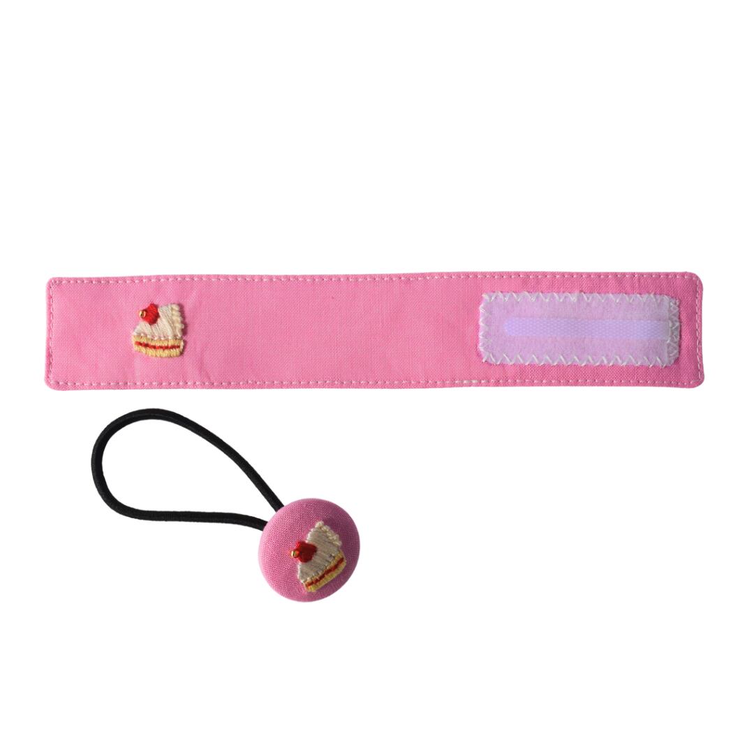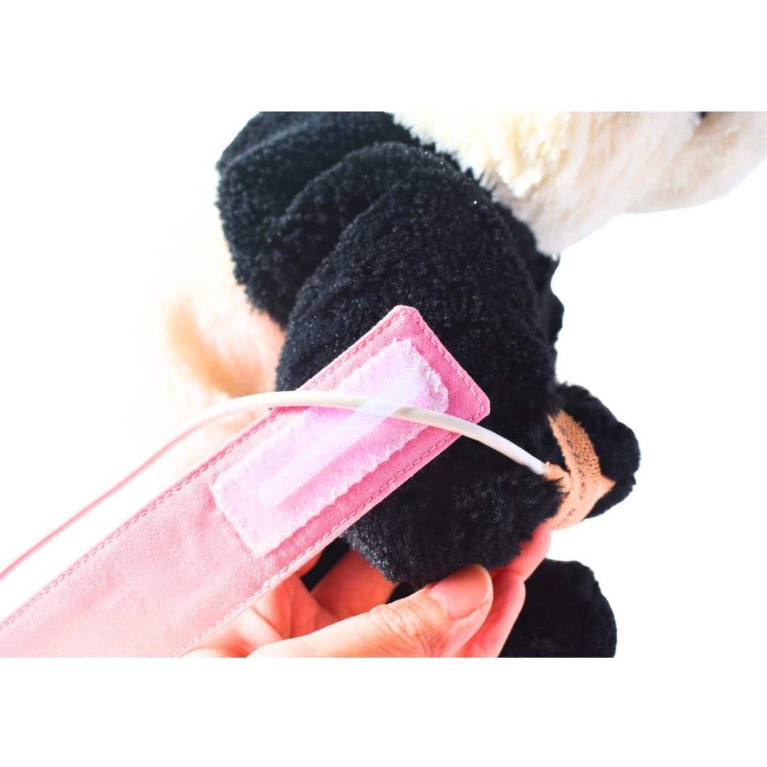 パルスオキシメンターのコードが絡まったりズレたりするのを防ぐ、便利で可愛い固定バンドです。