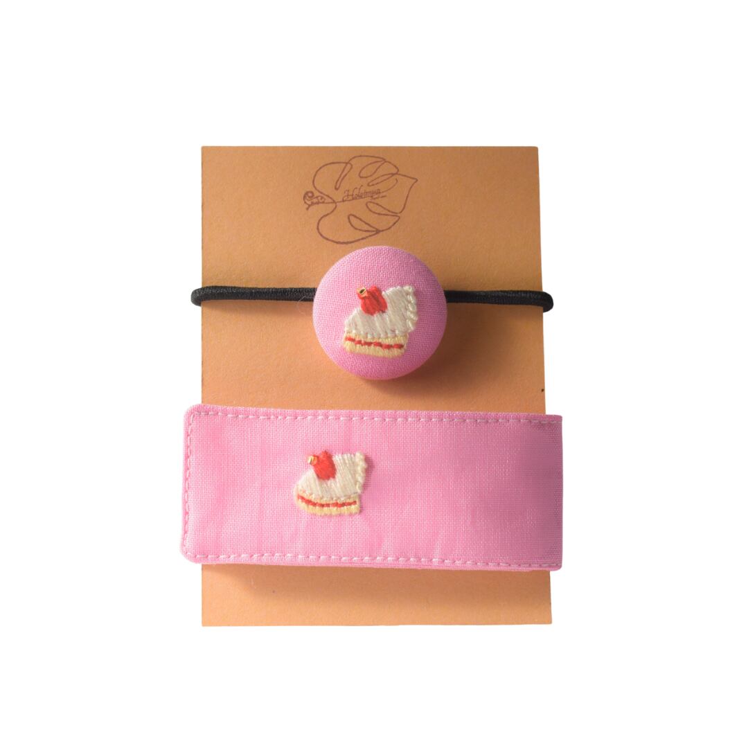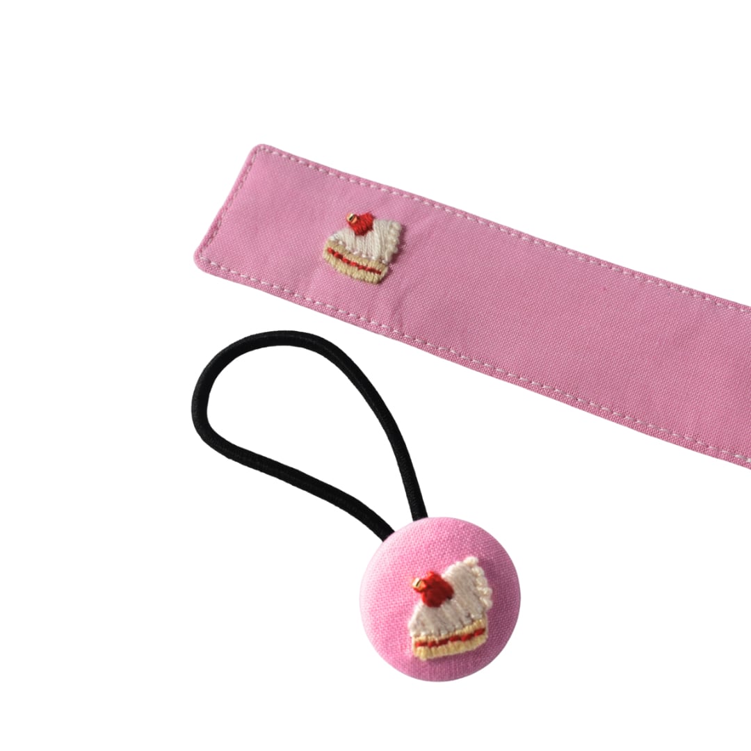 お揃いデザインのくるみボタンはヘアゴム仕立てです。